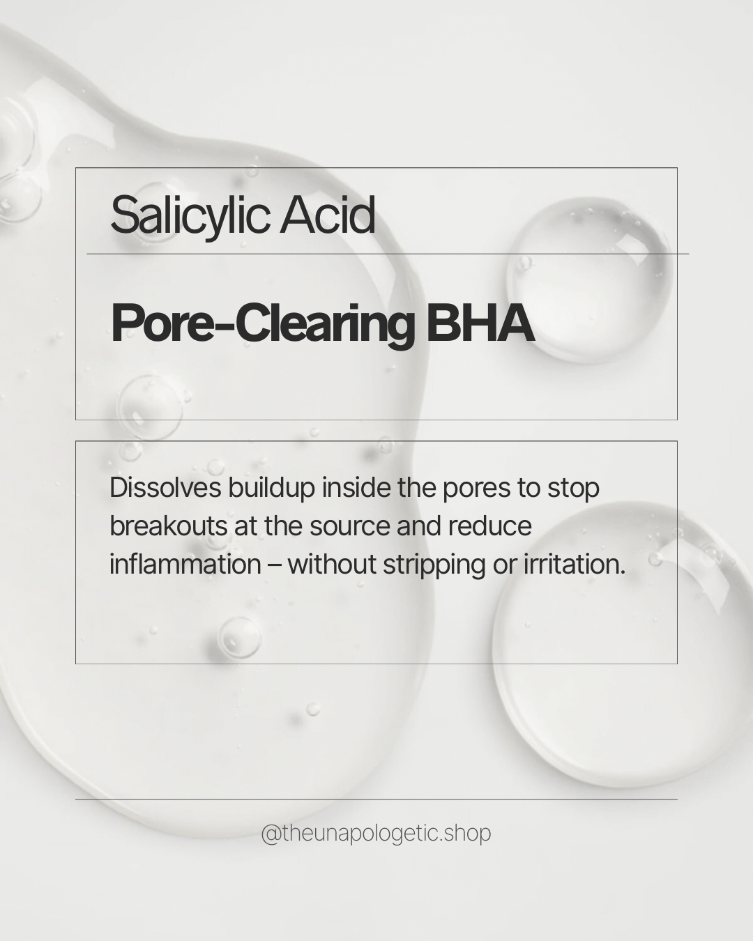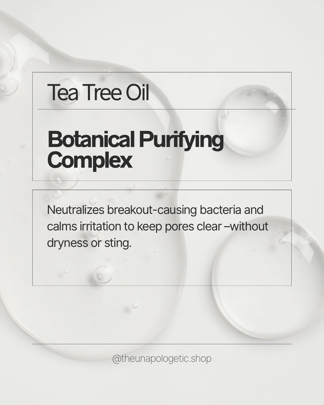 Powered by 2% Salicylic Acid and 3% Tea Tree Oil, this precision serum targets active breakouts at the source. It dissolves pore-clogging buildup, calms redness, and interrupts the cycle of future blemishes – without stripping or irritating the skin.