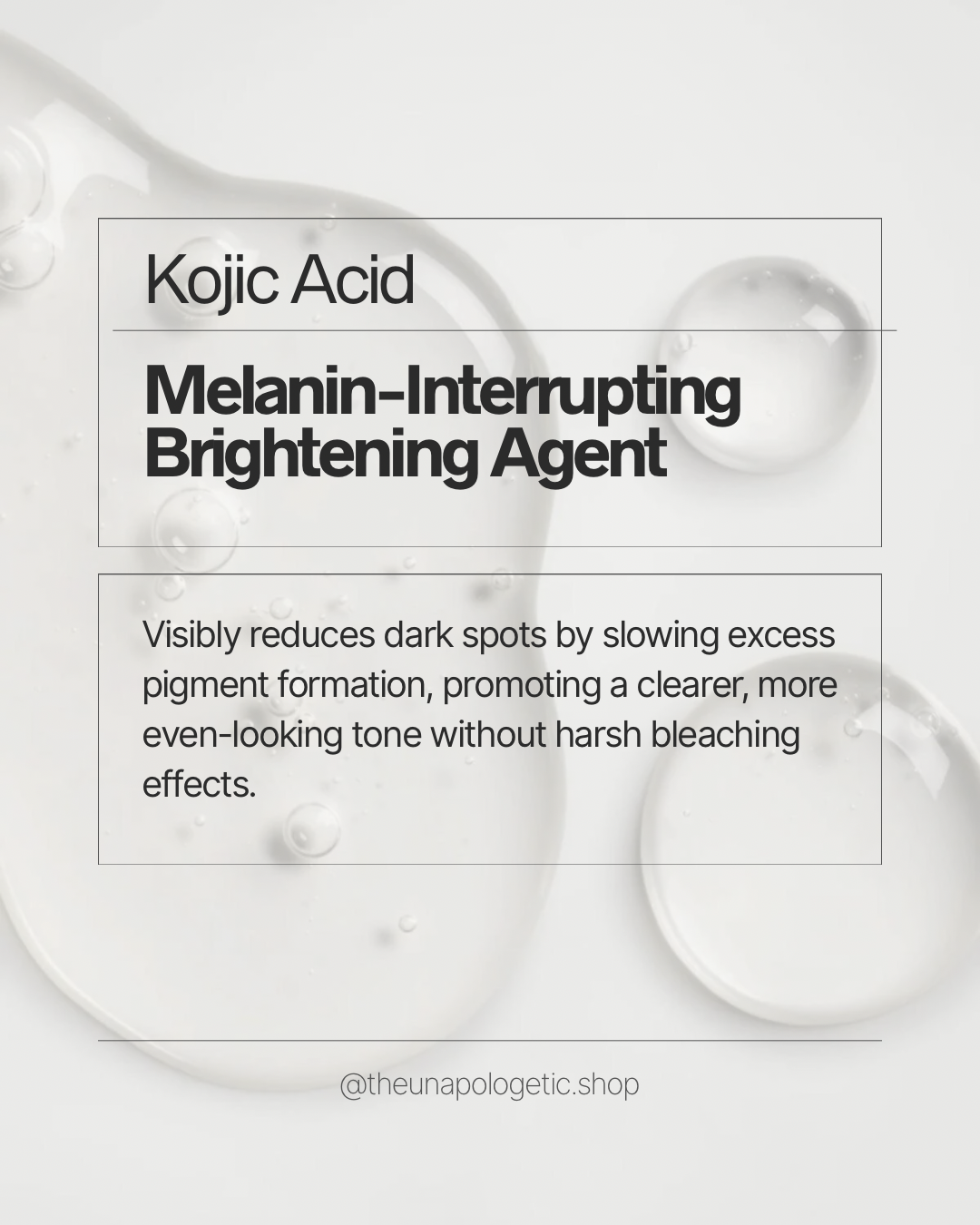Kojic Acid halts pigment production at the melanin trigger point. Vitamin C stabilizes tone signals and dismantles uneven color pathways. Botanicals suppress irritation feedback and keep high-friction zones steady. Discoloration loses retention and fades with consistent use.
